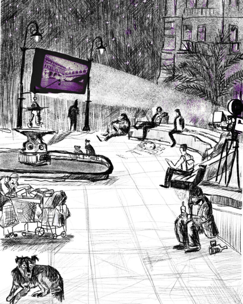 Ese día me sentí así, una noche de verano, donde proyectaron cortometrajes en la plaza echaurren; barrio puerto. Nos juntamos a tomar unas cervezas con vale,  había invitado a más amigos, pero me dijeron que no porque era muy de noche el ciclo y la echaurren es muy cuma, a la vale no le importa si donde tomamos es cuma porque le encanta estar en la calle y también goza de esa inmunidad fantasiosa que te proteje de los peligros nocturnos cuando te enfocas en pasarlo bien,