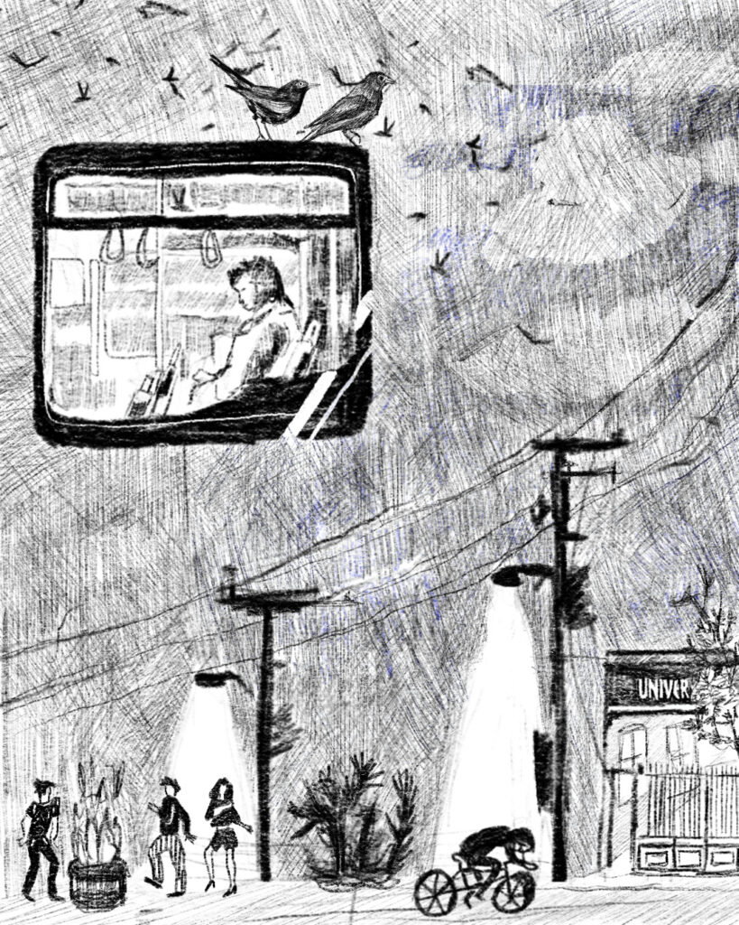 Hay horarios donde cantan los pájaros en la noche, hasta diría que los zorzales hacen compañía con tanta luz artificial a eso de las 4 de la mañana (que se escuchen otros pájaros los martes y los viernes, eso lo dejo para otros oídos). Hay avenidas que se secan en la noche, como la Alameda en Santiago. He visto ratones más grandes que los gatos (pericotes que le dicen), cuando se ponen de pie, no sabría decir si quieren pelear o saludar. Los pasos más impacientes se escuchan en la noche: muchas veces caminé por fuera de la posta central o del Sótero del Río: las carpas y los rukos con sueño o con insomnio… pero una espera por ser atendido o por saber qué será del futuro del que está adentro suena peor de noche. Sobretodo en esas noche donde el frío es notorio: con el concreto lacado de lluvia del día anterior y el cielo abierto. Si es por frío recuerdo que hace unos años nevó un viernes en la noche en Santiago. El sábado presenté en una variete en beneficio de un amigo. Hartos tramos de luz cortada, y nieve que aún quedaba en las zonas más sombrías. Los micreros en la noche abrigadísimos, como si fuesen figuras de peluche. Noches con poca gente en las calles. Inclusive ese viernes que nevó como a las cuatro de la mañana.